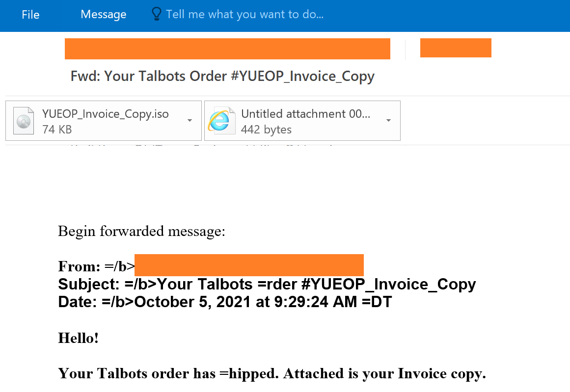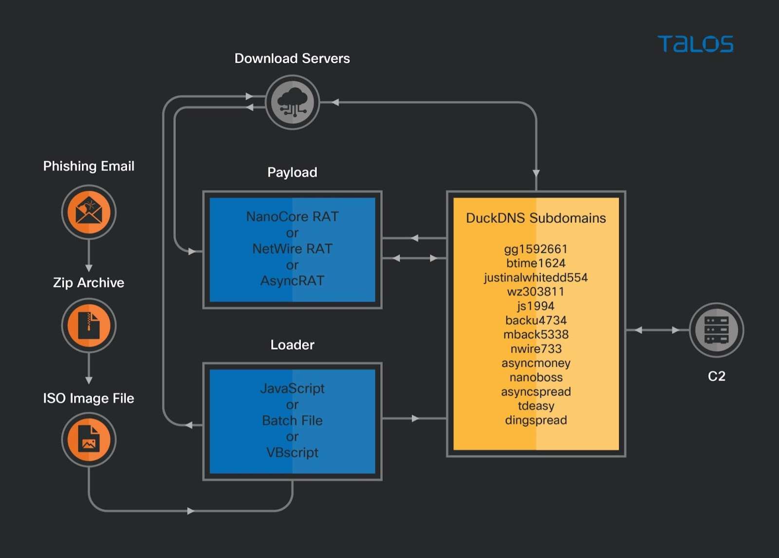Fuera de la dificultad de detectar a los agresores, el método de infección es bastante sofisticado. Talos explicó que el vector inicial de infección suele ser un correo phishing con un archivo ZIP malicioso adjunto. El ZIP contiene una imagen ISO con un loader JavaScrip, un archivo batch de Windows o un script en Visual Basic. Cuando alguno de estos scripts es ejecutado se conecta a un servidor en la nube para descargar la siguiente instancia: el malware RAT.