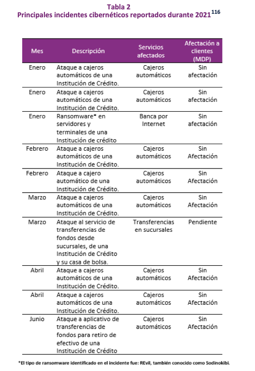 El documento señala que ocho de los 10 incidentes cibernéticos que han sido reportados por instituciones financieras en el primer semestre del 2021 fueron específicamente contra cajeros automáticos. De los otros dos incidentes que se han dado a conocer en el periodo, uno fue un ransomware en servidores y terminales de una entidad que afectó su servicio de banca por Internet, aunque no tuvo impacto económico. El otro ciberataque fue contra el servicio de transferencias de fondos desde sucursales de una entidad y su casa de bolsa.