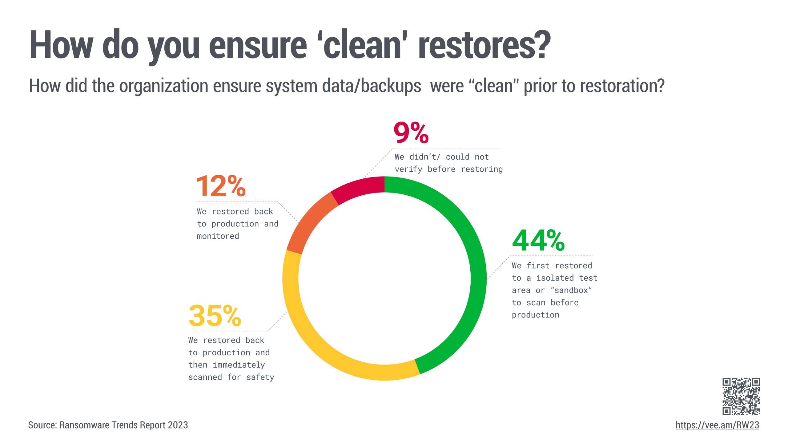 No obstante, el estudio encontró que cuando las organizaciones tratan de asegurarse de que los datos estén “limpios” durante una restauración, 44% dijo que primero los restauran en una área de prueba aislada y los analizan antes de regresar esa información a ambientes productivos.