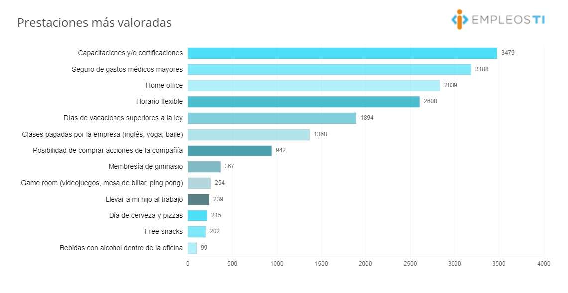 En el reporte se observa que la posibilidad de hacer home office fue la tercera prestación más valorada por los profesionales IT después de las capacitaciones y certificaciones y del hecho de contar con seguro de gastos médicos mayores.