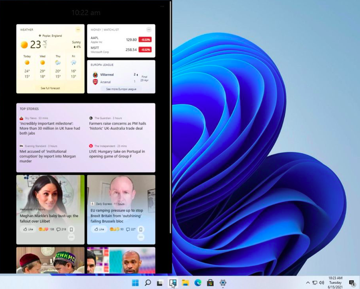La barra de tareas incluye un nuevo icono que tiene el título de “Widgets” que brinda información acerca del clima, noticias y otro contenido web de un vistazo, sin tener que abrir ninguna aplicación.