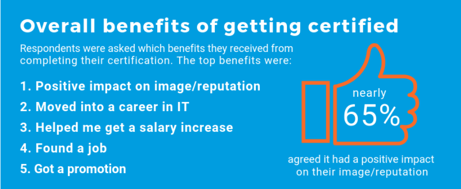 Una encuesta reciente reveló que 23% de los trabajadores IT reciben un incremento promedio de 20% luego de completar una certificación; 65% concordó en que este hito en su carrera había tenido impactos muy positivos en su reputación. De acuerdo con CompTIA, 72% de las empresas exigen ciertas certificaciones para algunas posiciones, y 91% cree que las certificaciones son un predictor confiable de un empleado exitoso.