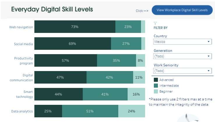 México se posicionó muy por encima del promedio, con 47 puntos, y también alcanzó calificaciones más altas que países como Estados Unidos, que marcó 36. El 52% de los trabajadores del país consideran que hoy se encuentran muy preparados para el trabajo digital, mientras el futuro también se ve auspicioso: con 46% capacitándose para el mundo digital de forma muy activa en estos momentos.