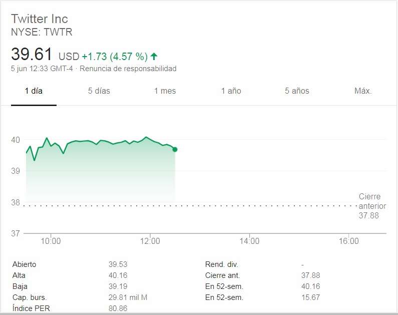 La noticia se dio a conocer la noche del lunes, y el martes las acciones de la empresa ya habían ganado 5%. Es necesario recordar que este es el primer año fiscal en toda la historia de Twitter en que ha presentado trimestres con ganancias, y las proyecciones apuntan a que el año también seguirá esa tendencia.